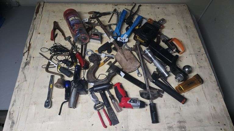 TOOLS ASSORTED LOT, HOUSEHOLD BASICS, DRILL BATTERY CHARGER, WIRE CUTTERS, SAW, SCREWDRIVERS, WRENCHES, TRUCK HITCH AND MORE!