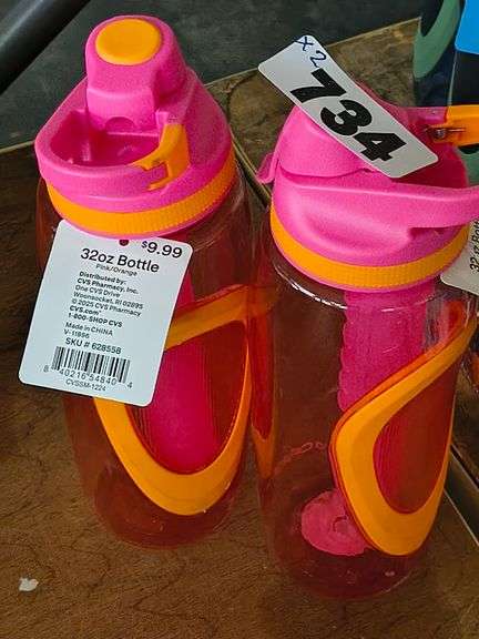 LOT 734 - CVS Pharmacy 32oz Water Bottle. A 32-ounce reusable plastic water bottle with a pink and orange design and a flip-top spout for drinking. - $9.99