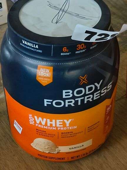 LOT 729 - Body Fortress 100% Whey Premium Protein, Vanilla, 1.74 lb. A whey protein supplement powder designed to build muscle mass, boost post-workout recovery, and support daily immunity. - $20 - 25
