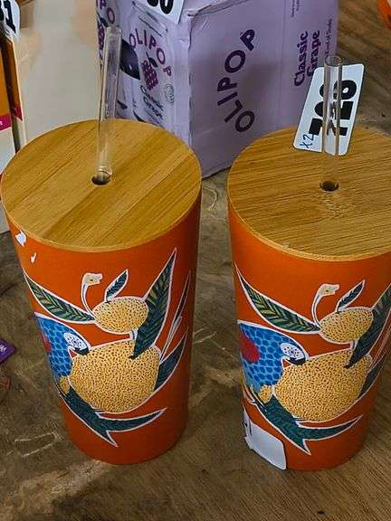 LOT 728 - Tropical Parrot Glass Tumbler with Bamboo Lid and Straw. A decorative glass drinking tumbler featuring a tropical parrot and fruit design, complete with a bamboo lid and a reusable glass straw (available in assorted colors). - $12 - 20