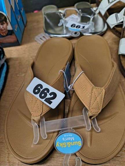 LOT 662 - Sun & Sky Men's Flip-Flop Sandals. A pair of casual men's flip-flop sandals featuring wide, stitched fabric straps and a textured footbed. - $10 - 15