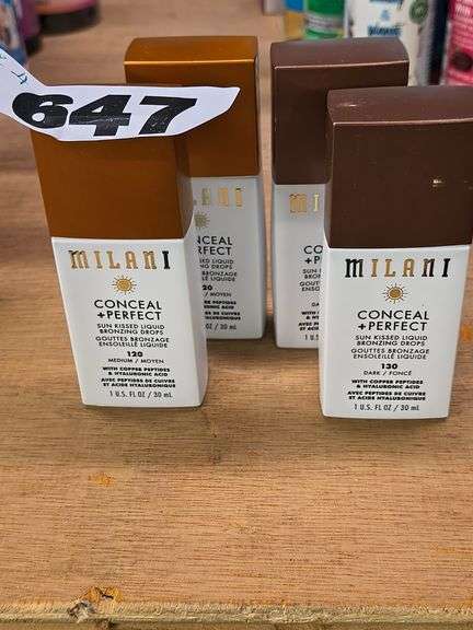 LOT 647 - Milani Conceal + Perfect Sun Kissed Liquid Bronzing Drops. A liquid bronzer infused with copper peptides and hyaluronic acid to deliver a buildable, sun-kissed glow (available in assorted colors). - $14.99