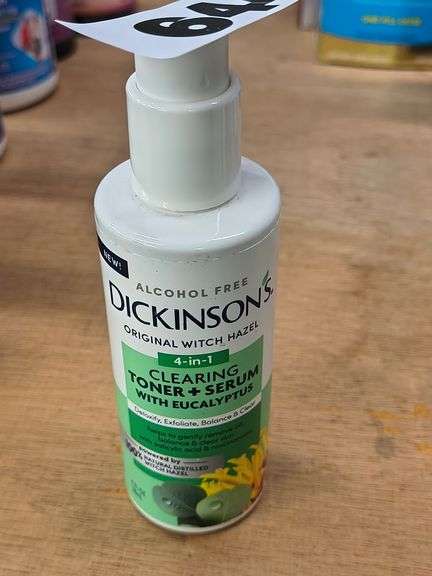 LOT 644 - Dickinson's Original Witch Hazel 4-in-1 Clearing Toner + Serum with Eucalyptus. An alcohol-free facial toner and serum designed to detoxify, exfoliate, balance, and clear skin with ingredients like witch hazel, eucalyptus, salicylic acid, and niacinamide. - $7 - 10