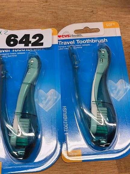 LOT 642 - CVS Health Travel Toothbrush (Soft). A compact, foldable toothbrush with soft bristles and a built-in tongue cleaner, designed for travel (available in assorted colors). - $2 - 4