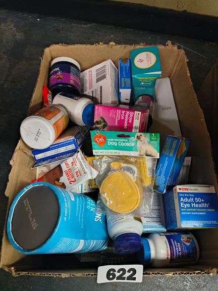 LOT 622 - Wholesale Lot of Assorted Health, Wellness, and Pet Products. A mixed box of consumer goods including dietary supplements from brands like CVS Health and Vital Proteins, pet supplies, and snack items. - $125 - 175 out of date will refund