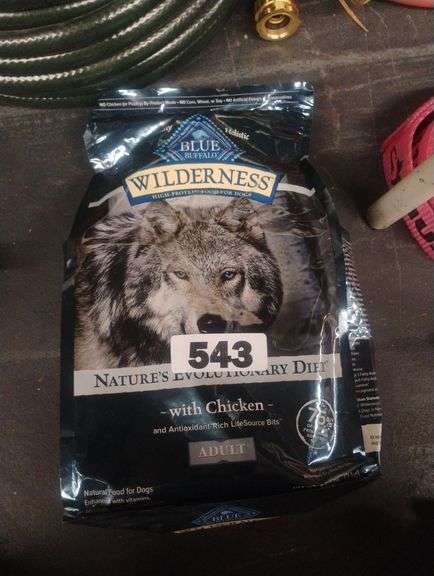 LOT 543 - Blue Buffalo Wilderness Nature's Evolutionary Diet Adult Dry Dog Food, Chicken Recipe. A high-protein, grain-free dry dog food made with real chicken to support the nutritional needs of adult dogs. - $22 - 26