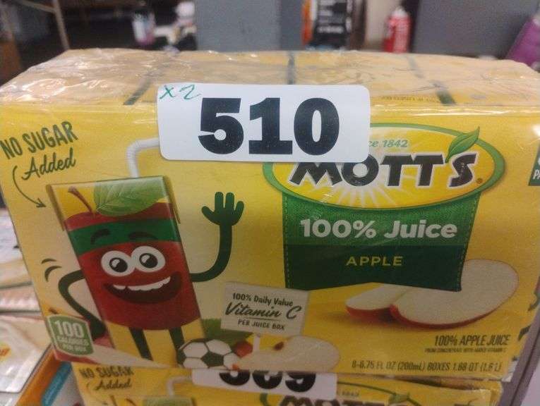 LOT 510 - Mott's No Sugar Added 100% Apple Juice, 8-Pack. An 8-pack of 6.75 fl oz juice boxes containing 100% apple juice with no added sugar. - $4.00 - 6.00