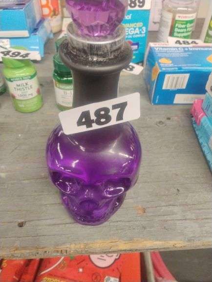 LOT 487 - Purple Skull Glass Decanter with Gem Stopper. A decorative glass decanter shaped like a skull with a metallic purple finish and a faceted gem-like stopper. - $25 - 35