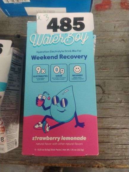 LOT 485 - WaterBoy Weekend Recovery Hydration Electrolyte Drink Mix, Strawberry Lemonade. A sugar-free, strawberry lemonade flavored electrolyte powder with added vitamins and ginger extract, designed to be mixed with water for hydration and recovery. - $10 - 12