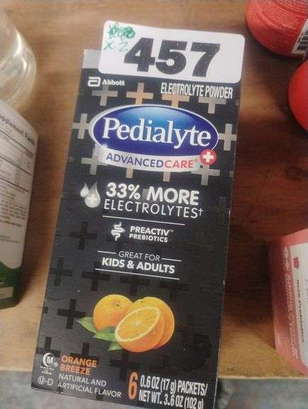 LOT 457 - Pedialyte AdvancedCare Plus Electrolyte Powder, Orange Breeze (6 Count). An advanced hydration electrolyte powder with PreActiv Prebiotics designed to quickly replenish fluids and electrolytes for both kids and adults. - $8 - 12