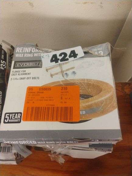 LOT 424 - Everbilt Reinforced Wax Ring with Bolts. This toilet installation kit includes a reinforced wax ring with a flange and snap-off bolts to create a secure seal between the toilet and floor drain. - $4 - 6