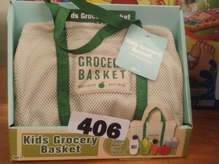 LOT 406 - Kids Grocery Basket Playset. A children's toy playset featuring a mesh grocery basket and five plush food characters for imaginative play. - $15 - 25