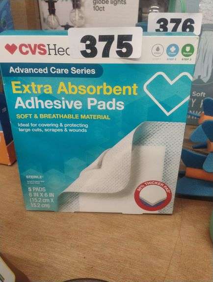 LOT 375 - CVS Health Advanced Care Series Extra Absorbent Adhesive Pads, 6 in x 6 in, 5 Count. A pack of five large, sterile, and extra-absorbent adhesive pads ideal for covering and protecting significant cuts, scrapes, and wounds. - $12 - 15
