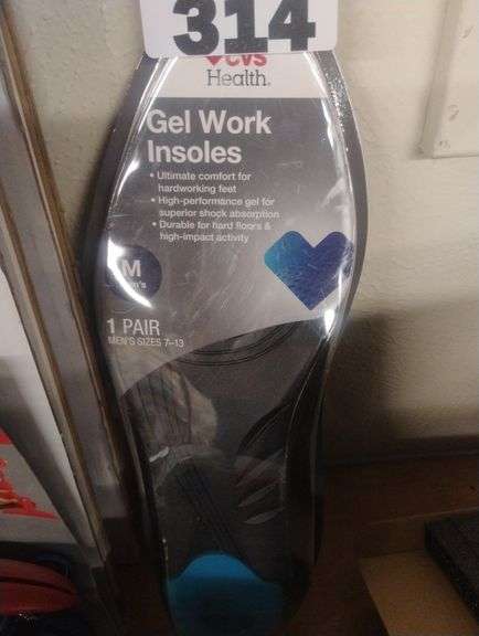 LOT 314 - CVS Health Men's Gel Work Insoles, Sizes 7-13. These high-performance gel insoles are designed to provide superior shock absorption and comfort for hardworking feet on hard surfaces. - $12 - 18