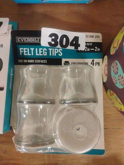 LOT 304 - Everbilt 1-1/2 in. to 2 in. Felt Leg Tips (4-Pack). These are clear plastic, felt-bottomed cups designed to fit over furniture legs to protect hard surface floors from scratches. - $10 - 15
