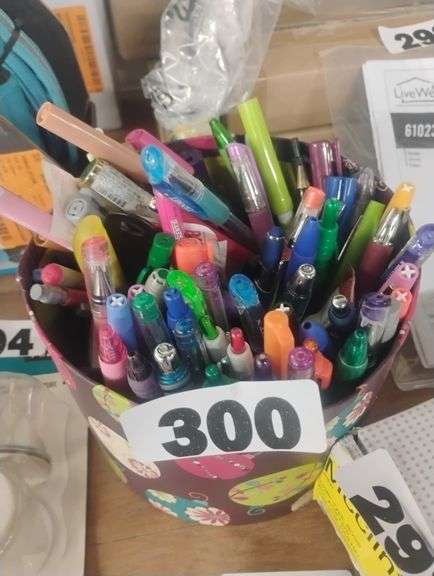 LOT 300 - Lot of Assorted Pens and Markers. A decorative cup filled with a miscellaneous collection of used pens, markers, and highlighters. - $5 - 15
