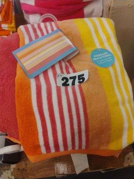 LOT 275 - Generic Striped Standard Beach Towel. A standard-sized beach towel measuring 31 x 61 inches with a colorful striped pattern (available in assorted colors). - $10 - 20