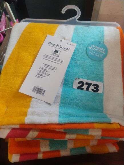 LOT 273 - CVS Pharmacy Standard Beach Towel. A 31-inch by 61-inch, 100% cotton beach towel with a striped pattern (available in assorted colors). - $14.99