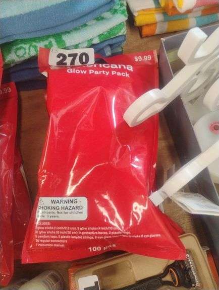 LOT 270 - Americana Glow Party Pack (100 pcs). A 100-piece kit containing various glow sticks and connectors for creating fun party accessories like bracelets, necklaces, and glasses. - $9.99
