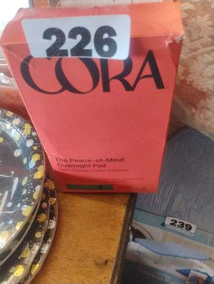 LOT 226 - Cora The Peace-of-Mind Overnight Pad. A 34-count box of overnight sanitary pads made with a 100% organic cotton topsheet for leak protection. - $10 - 15