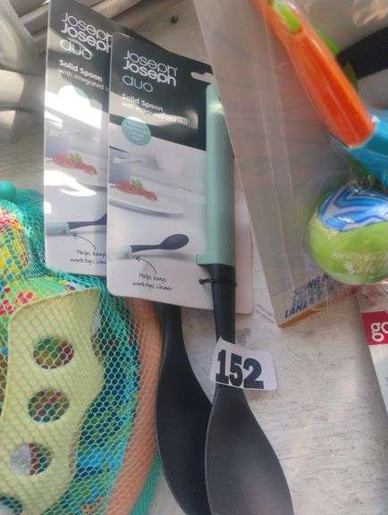 LOT 152 - Joseph Joseph Duo Solid Spoon with Integrated Tool Rest. A cooking spoon designed with an integrated tool rest in the handle to keep the spoon head elevated off of countertops (available in assorted colors). - $6 - 9