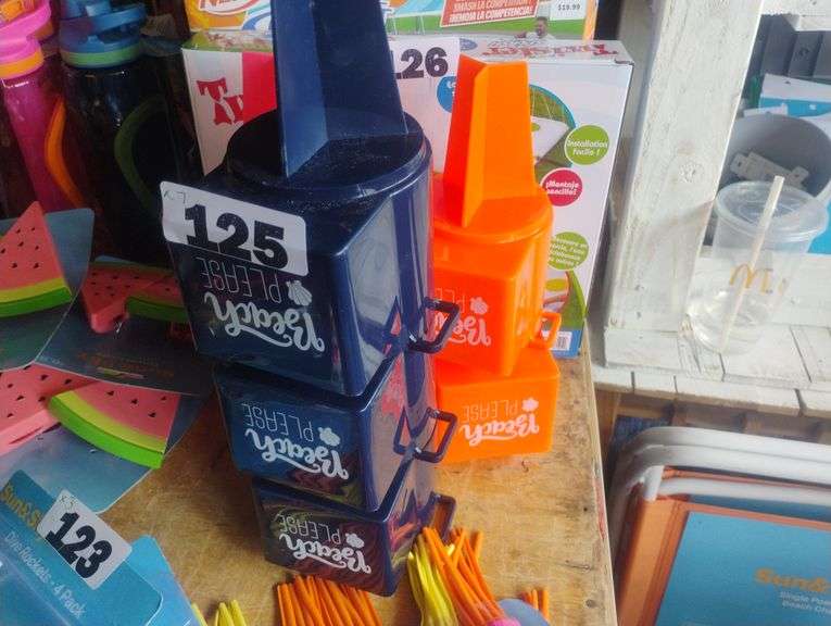 LOT 125 - Beach Please Portable Beach Ashtray/Trash Can. A personal and portable container designed for disposing of cigarette butts and small trash at the beach (available in assorted colors). - $8 - 12