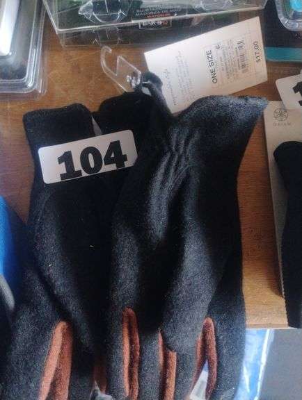LOT 104 - Target 'Responsible Style' Fleece Gloves. A pair of one-size black and brown fleece gloves made with recycled polyester. - $17.00