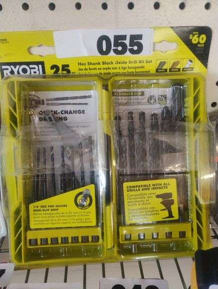LOT 55 - Ryobi 25-Piece Hex Shank Black Oxide Drill Bit Set. A 25-piece set of black oxide coated drill bits with 1/4-inch hex shanks for use with drills and impact drivers on metal, wood, and plastic. - $25 - 30