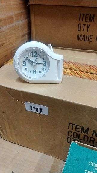 This compact analog alarm clock features a sleek, white plastic body with a contemporary teardrop-shaped design. The dial is easy to read with large, bold Arabic numerals and luminous hands for visibility in low light.