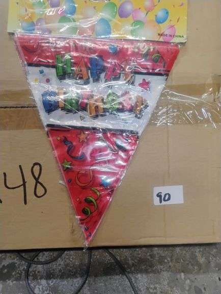 LOT 90 - Colorful Happy Birthday Party Bunting Banner. This is a decorative plastic triangular bunting banner featuring colorful letters spelling 'Happy Birthday' for party celebrations. - $4.99