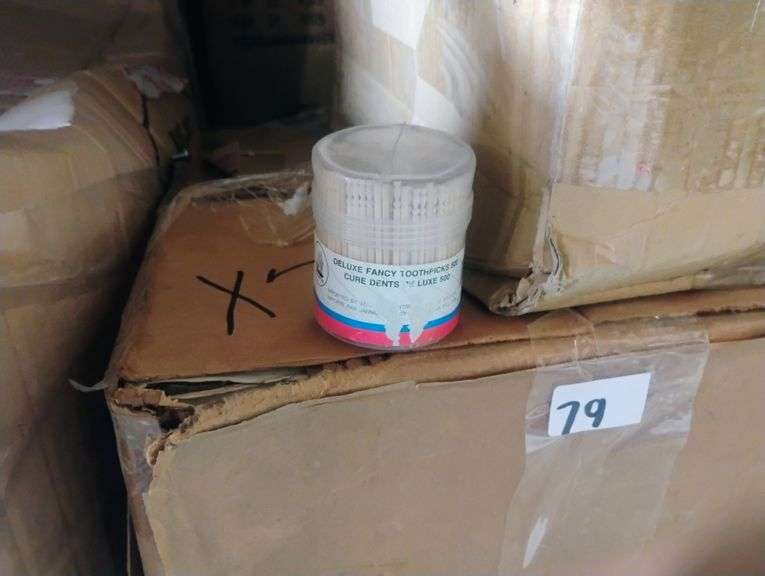 LOT 79 - JANM Deluxe Fancy Toothpicks 500 Count. These are wooden toothpicks for oral hygiene and food service, presented in a clear plastic dispenser. - $3.50