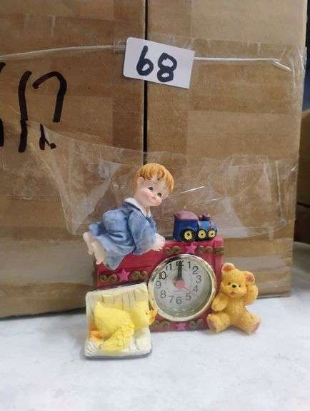 LOT 68 - Nursery Theme Baby Boy Quartz Decorative Desk Clock. A charming quartz desk clock featuring a baby boy, a train, a teddy bear, and a duck, designed to add a playful touch to a child's room or nursery. - $22.00