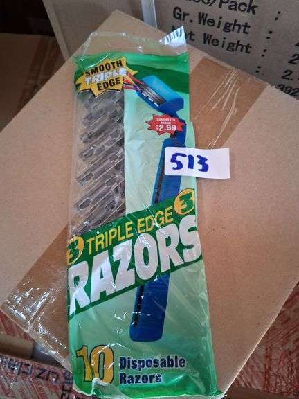 LOT 513 - Smooth Triple Edge 3-Blade Disposable Razors (10-count). These are disposable razors designed with three blades to provide a smooth shaving experience. - $2.99