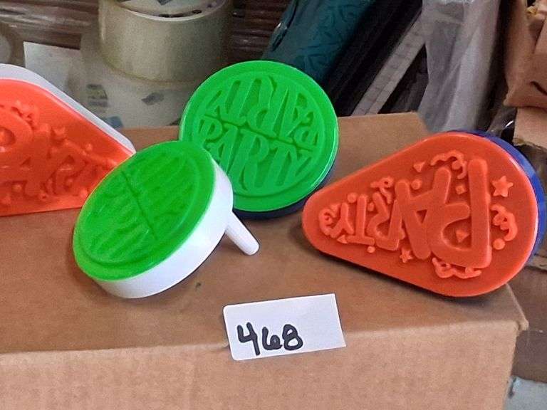 LOT 468 - Generic Party Themed Rubber Stamps Set. This set includes three colorful novelty stamps designed to imprint 'PARTY' themed festive designs with stars and confetti. - $7.00