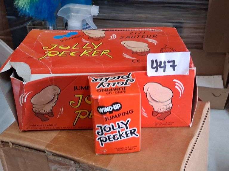 LOT 447 - Jolly Pecker Wind-Up Jumping Toy (Dozen Pack). This novelty item is a wind-up toy designed to jump when activated, typically sold as a gag gift or party favor. - $35.00
