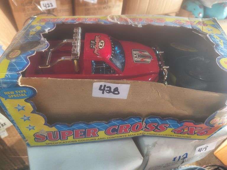 LOT 428 - K.K. Car Power Super Cross 4x4 Toy Truck. This is a red toy off-road truck with oversized wheels, featuring 'CAR POWER K.K.' branding on its hood, designed for rugged play. - $15.00