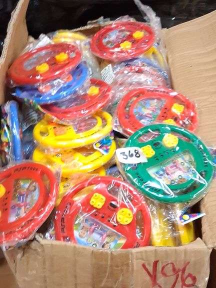LOT 368 - PJP 1000 Handheld Water Game Steering Wheel Toy. This is a simple plastic toy designed as a steering wheel, featuring an enclosed water game where the user manipulates small objects within a liquid-filled chamber. - $3.00