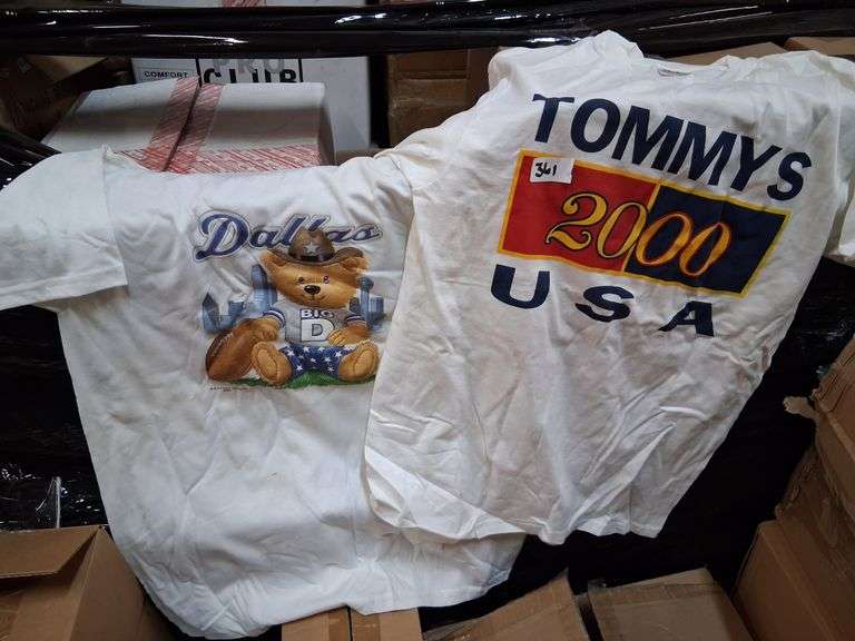 LOT 361 - Vintage Y2K Graphic T-Shirt Lot (Tommys 2000 USA & Dallas Big D Bear). This lot includes two white short-sleeve vintage t-shirts: one featuring 'TOMMYS 2000 USA' graphics and another with a 'Dallas Big D' cowboy bear design. - $60.00