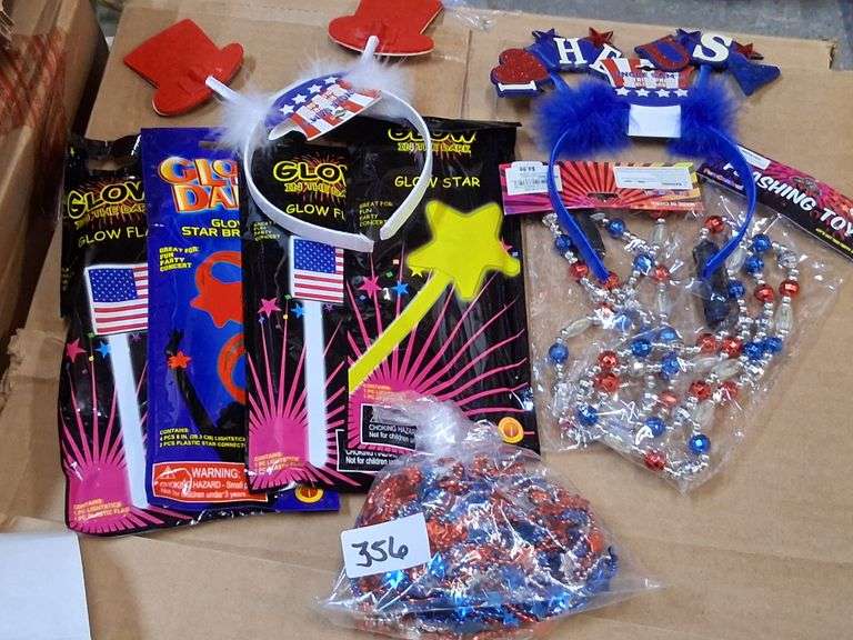 LOT 356 - Patriotic Celebration Party Favor Collection. This collection includes glow-in-the-dark American flag and star wands, decorative USA-themed headbands with feathers, and multiple strands of red, white, and blue beaded necklaces, suitable for festive national holiday events. - $35.00