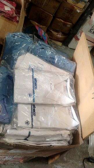 A collection of Elbeco brand 'Shirts of Distinction' in original plastic packaging, featuring both white and blue styles. These professional-grade uniform shirts appear unused and are organized within a shipping box for bulk sale.