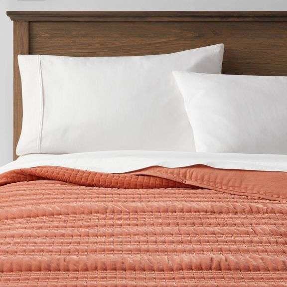 Lend an extra layer of warmth to your sleeping nook with this Lofty Velvet Quilt from Threshold?. Crafted out of a silky-smooth velvet with generous filling, this quilt wraps you in cozy comfort night after night. The velvet quilt is adorned with an allover quilted design in a solid hue for a charming look while lending a decorative element to the top of your bed. Pair this lofty velvet quilt with your choice of sheets and decorative pillows to create a stunning bedroom you'll love to relax in. Threshold?: Looks like home, feels like you.