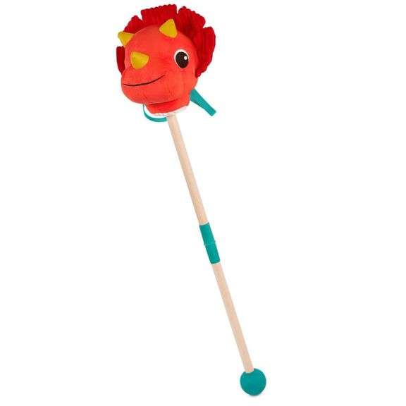 Hop on and ride with Tommy Triceratops from B. toys! A unique twist on the classic hobbyhorse, this friendly Hop 'n' Ride dinosaur is ready to gallop into play time! Tommy Triceratops has an interactive plush head, sturdy reins, and an easy-to-assemble wooden riding pole. The plush head features different sensory textures for kids to explore, and a button that plays fun sound effects! Children can hold onto the sturdy reins as they hop and ride around, and parents can rest easy thanks to the non-scratch base on the pole. As an active toy, this ride-on dino also helps kids improve gross motor skills and coordination during playtime. 2 x AAA are required and included. Recommended for children 2 years and over.