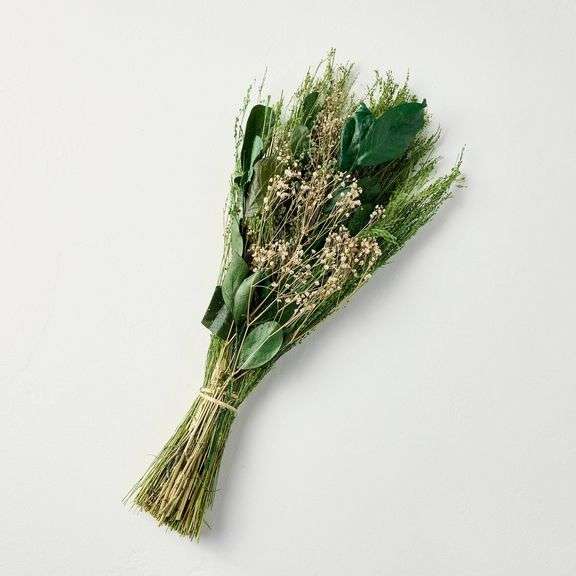 Create a gorgeous arrangement in your home or office space with this Preserved Mixed Leaf and Grass Spring Bundle from Hearth & Hand? with Magnolia. This bundle of stems features preserved green leaves and dried grass tied together for a natural look that blends well with a variety of decor. Display the stems individually in a slim vase or as part of a bold arrangement for an eye-catching aesthetic. Hearth & Hand? with Magnolia: Gather ? Create ? Enjoy