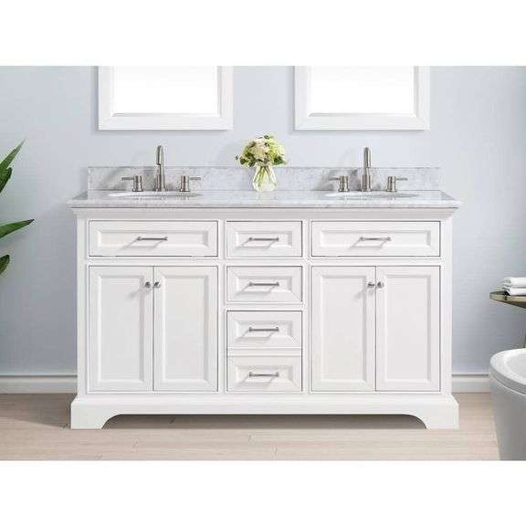 About This Product - Home Decorators Collection Windlowe 61 in. Double Sink White Bath Vanity with White Carrara White Marble Top (Assembled)